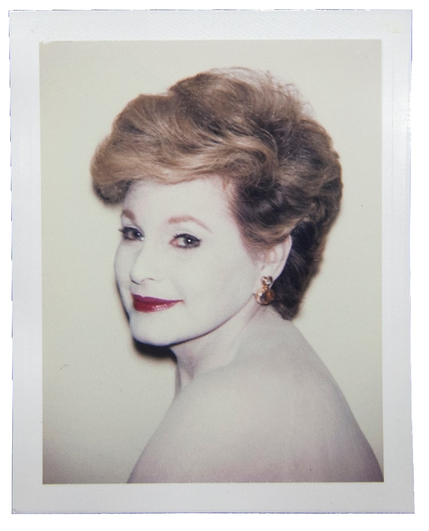 3/4, color bust portrait of an unidentified woman facing proper right. She has short dirty blond hair hair that's styled with brushed out curls. She is wearing jewel earrings, white makeup, red lipstick, and a white tube top that is barely visible. She is set against a solid off-white background.