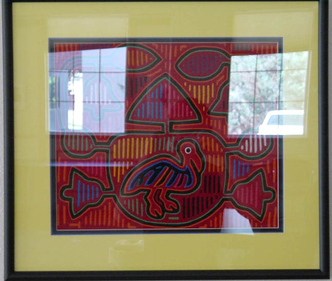 Colorful appliqué (mola), with geometric style design depicting a symmetrical, organic shape in the background and the profile of a bird in the foreground.