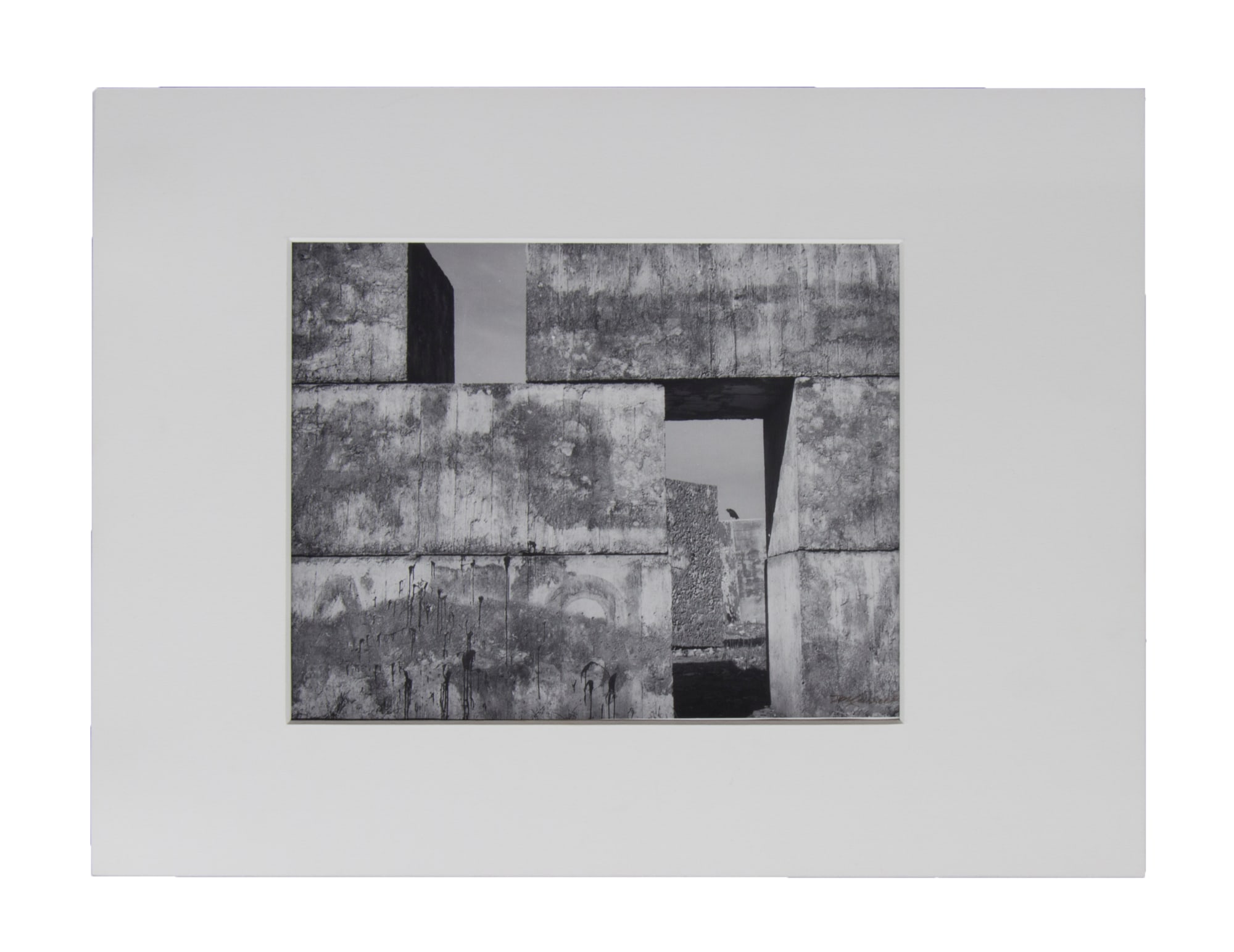 Image of a large stone wall with gaps to walk through. The shot was framed so that the walls look like "L" shapes. In the distance, seen through the gaps, a lone vulture is perched on the ledge of another section of the wall.
