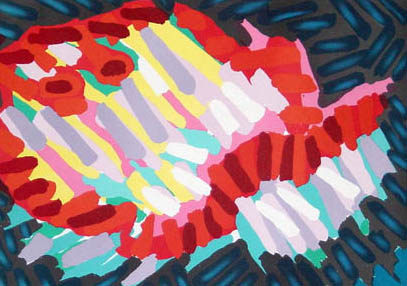 Abstract composition comprised of overlapping painterly linear marks that seem to form the shape of fish like animal with a two-tone red stripped outline.