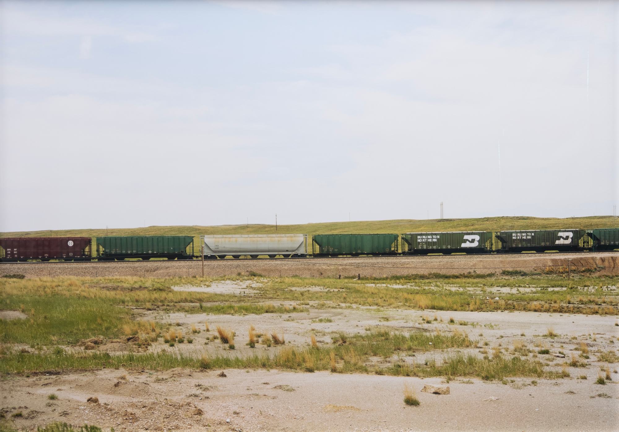 Untitled (Red, green, silver train cars, Upton, Wyoming)
