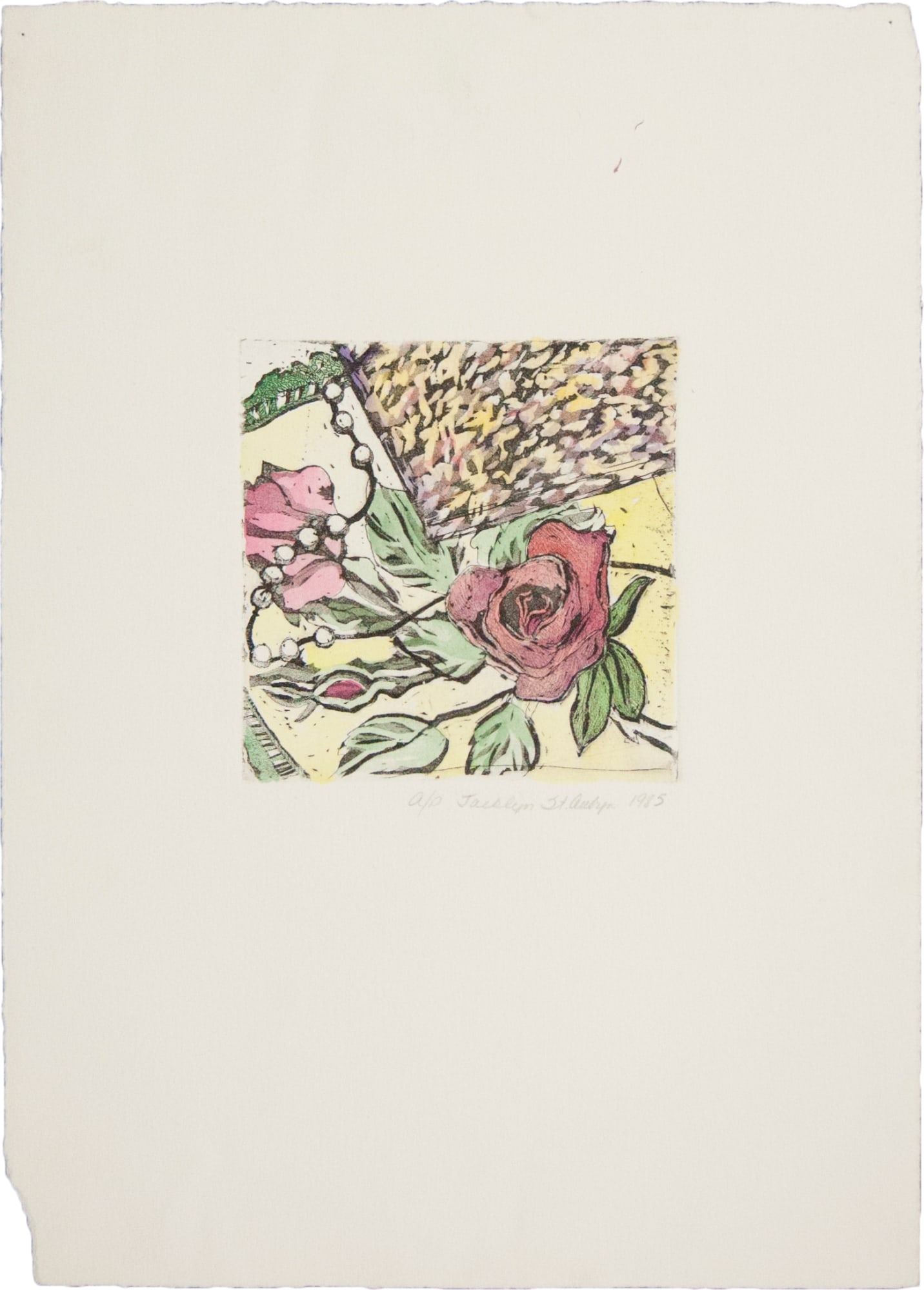 In the center of a 14 5/8" x 10 1/2" page paper is a 5" x 5" etching. The image is of roses and pearls, laying on a mirror or colored tray. Possible speckled jewelry box sits next to the previous items.