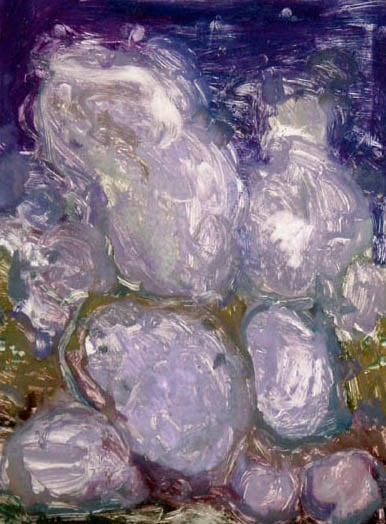 abstract composition with tones of dark and light purple with cloud like shapes. green as well.