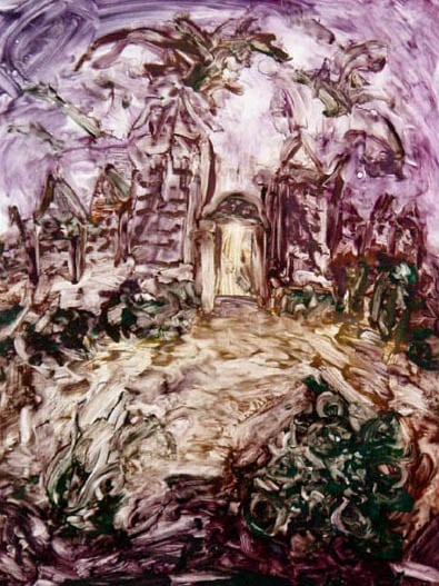 Abstract impressionistic scene of a road laeding to church like building. Purple, green and light brown