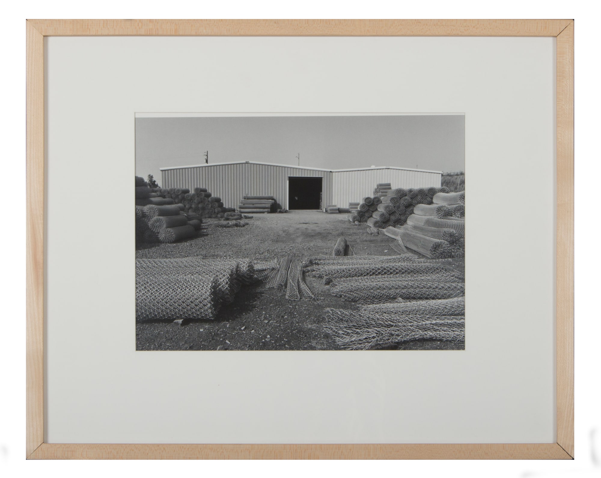 Black-and-white photograph of a warehouse and yard filled with rolls of chain link fencing.