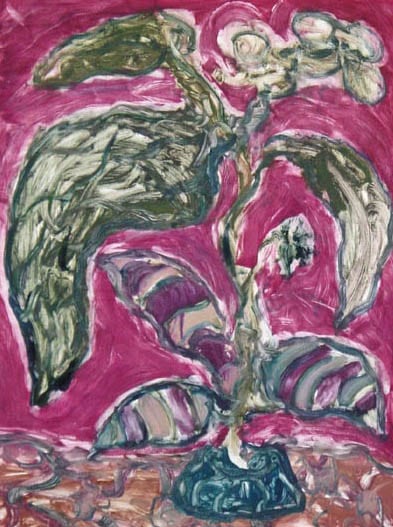 pink/purple background with green plant in a small vase on surface. magenta, green, blue, brown