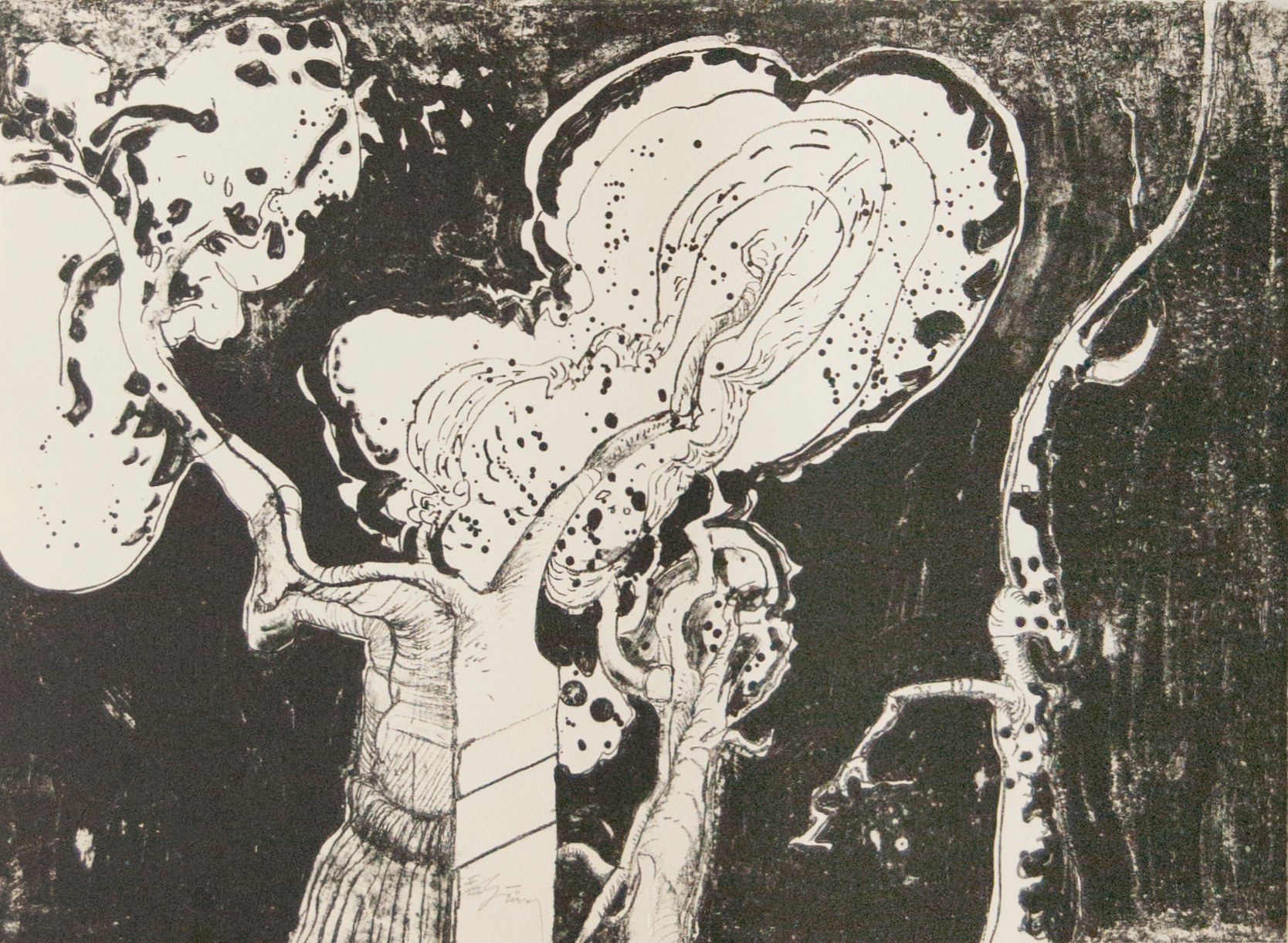 Monochromatic print. 3 large tree trunks make up the image. The tree trunks and foliage are mainly the white of the paper with details of black. The background landscape is primarily black. Deckled edges. White arches and tamarind chops on bottom center.