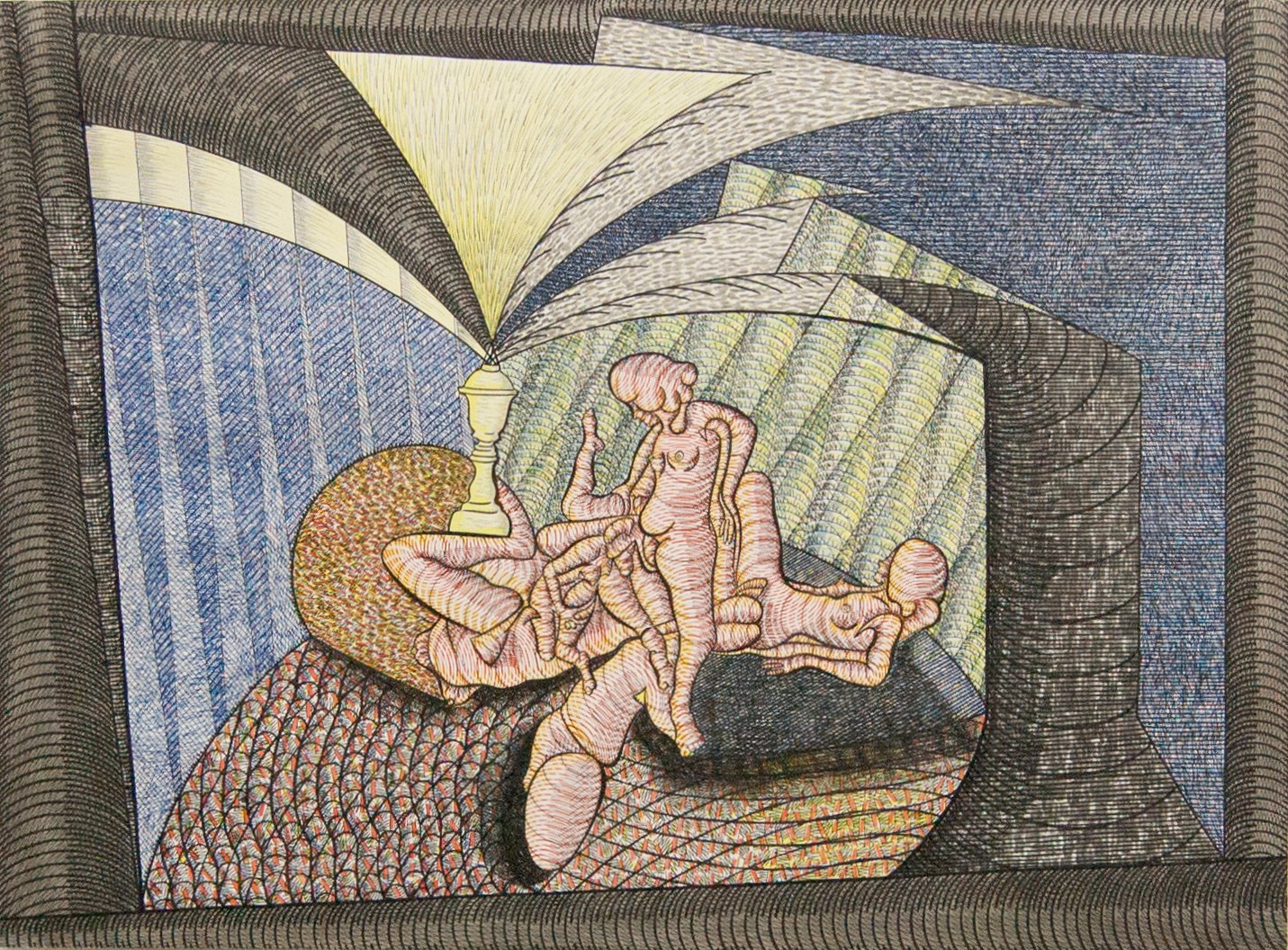 Abstract figures make up the center of the piece. They are surrounded by an abstract background, filled with geometric shapes and different lines. Very detailed. Object above the figures has triangular shapes shooting out of it.