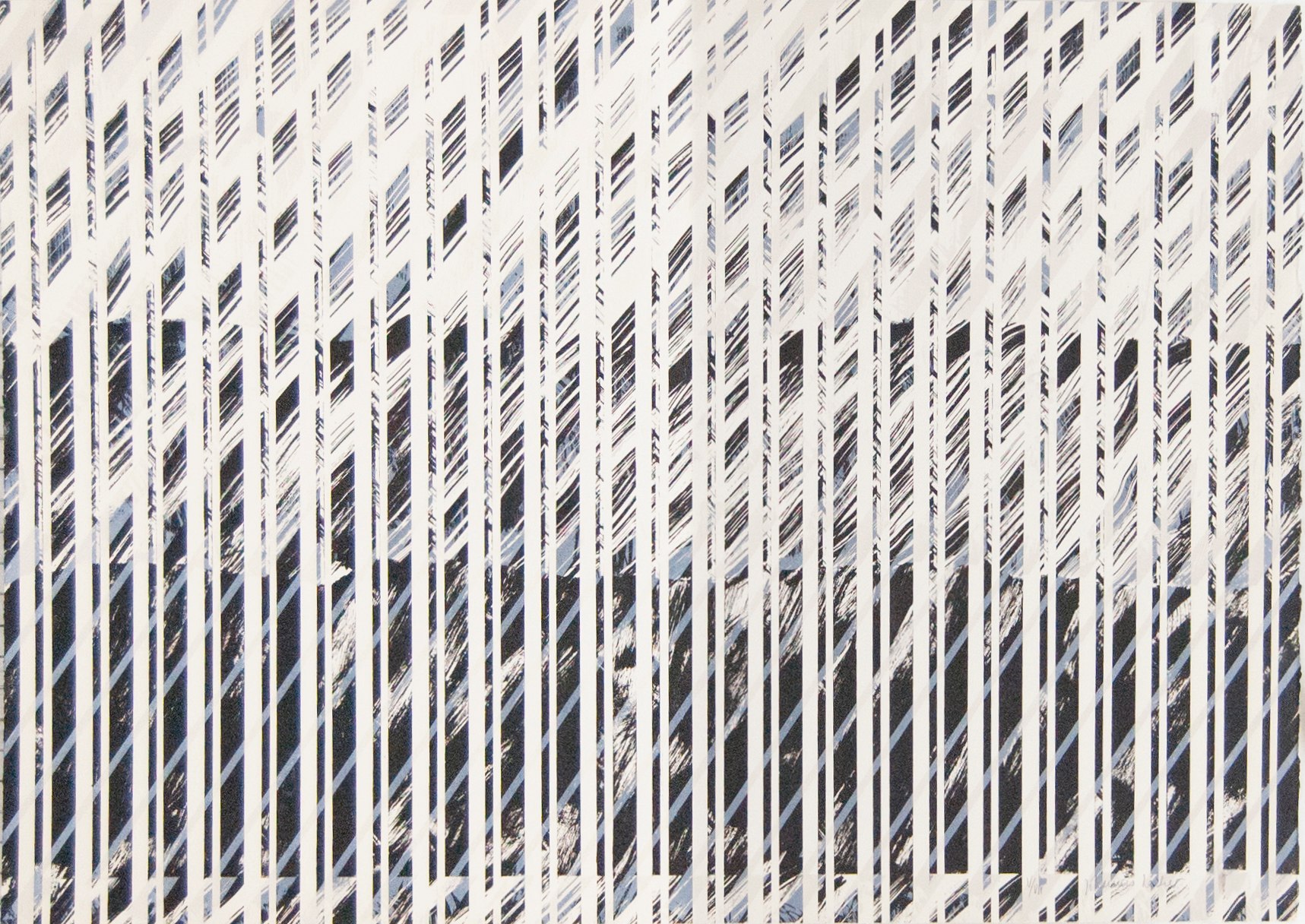 Columns of diagonal hatch marks the increase in density toward the bottom. Blue diagnoal lines are solid in color and the black marks are done in a drybrush style. White vertical lines are created by the negative space of the paper.