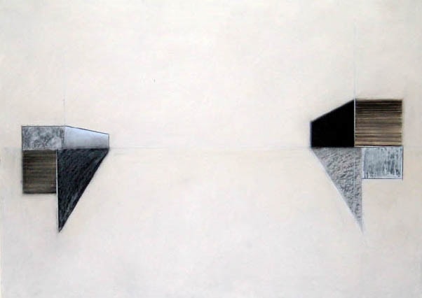 Quadrilateral geometric shapes, anchored by right triangles, orientated on opposite sides of the horizon line. Shapes against a white background