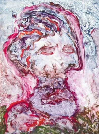 An abstract impressionistic style bust portrait. Face is rendered w/ painterly brush strokes. Background has a negative space effect. magenta, purple, orange, green, indigo, pink