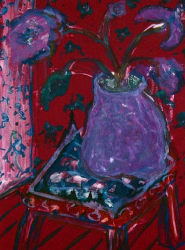 an upholstered chair with purple vase full of flowers, situated in a deep magenta room w/ wallpaper. Matisse like