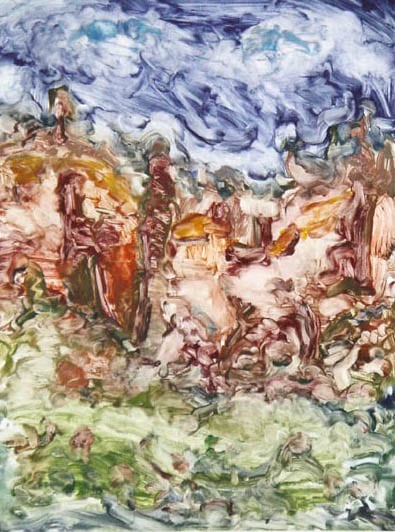 An abstract Impressionistic landscape. There are 2 abstract bands of color; greens on the bottom, browns mid, and indigo on top.