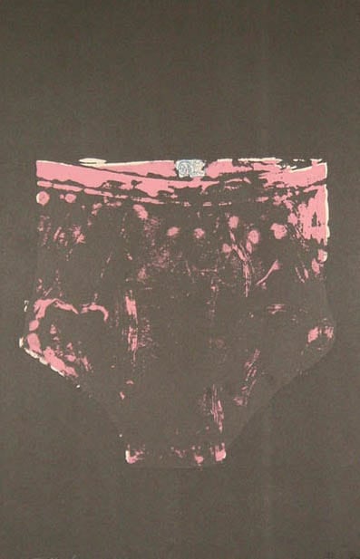 Image of a pair of men's briefs colored pink and surrounded by a decorative border. The background is solid black.