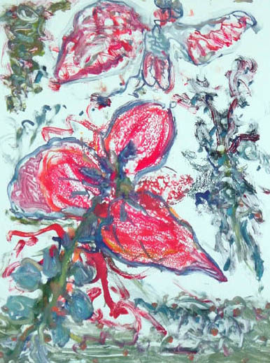Abstract image of a vivid pink, 3 petal flower. Above is a winged bug. Painterly brushstrokes. cool toned green, pink, vivid orange