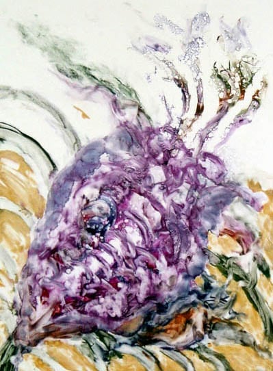 Abstract, predominantly purple, beet like shape. background yellow with green rays