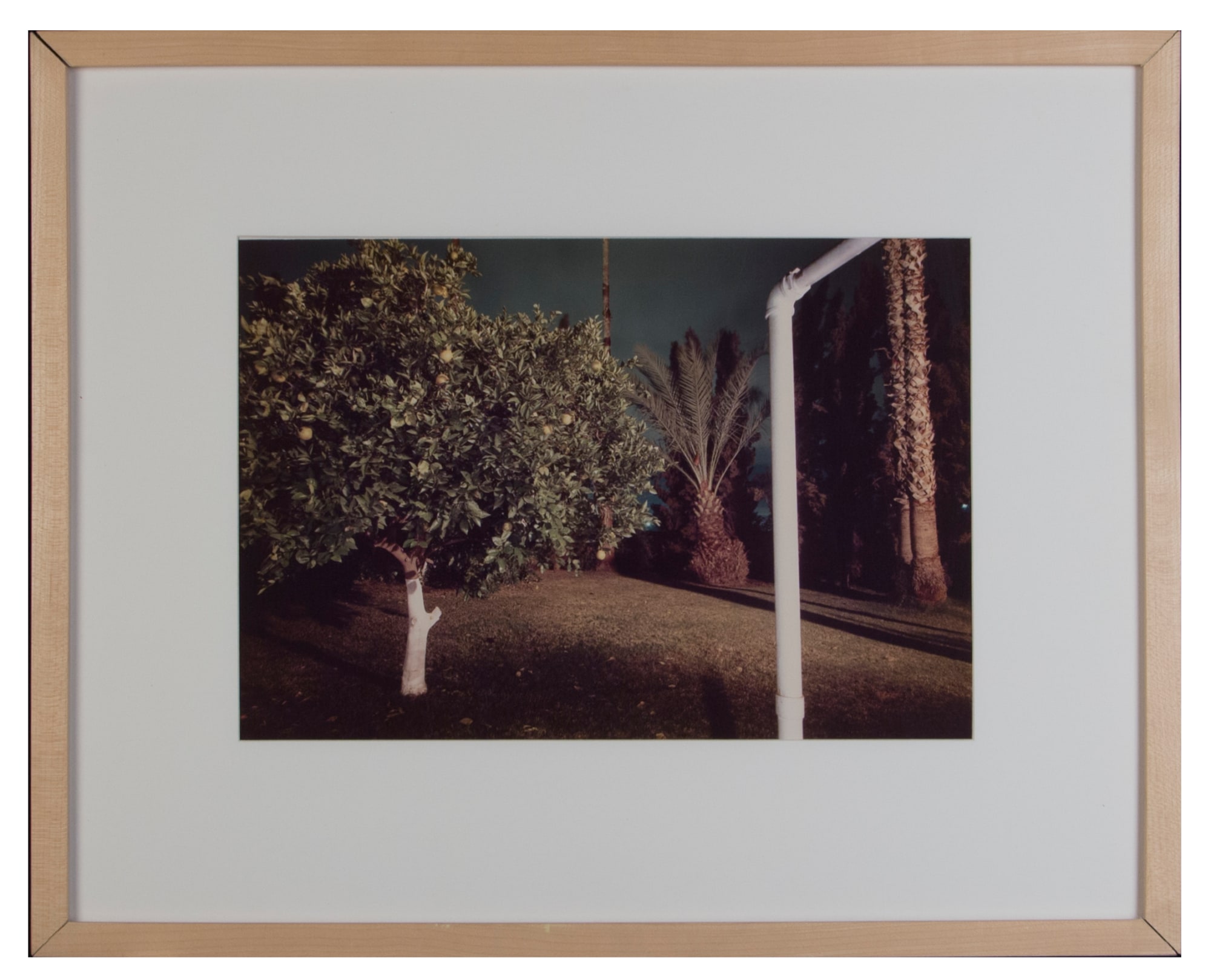 A color photograph of several trees growing in a lawn. There is a white pipe in the right of the composition.