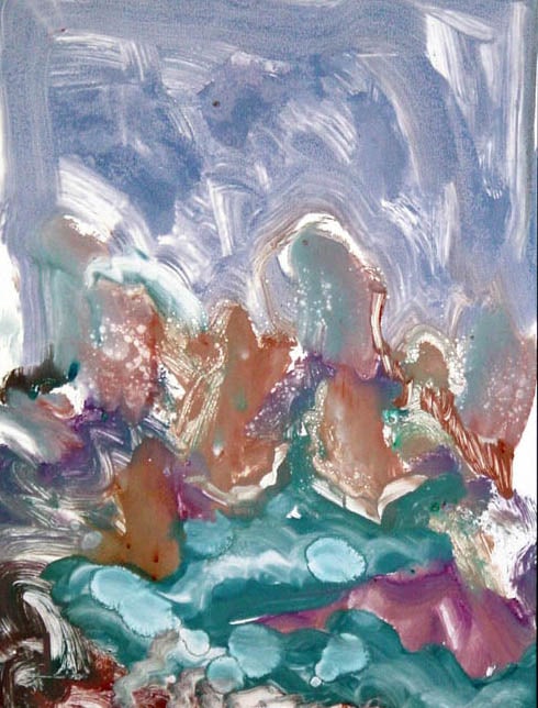 Abstract rendered with painterly brushstrokes and splatter technique of purple, mauve, periwinkle and cool blue tones.