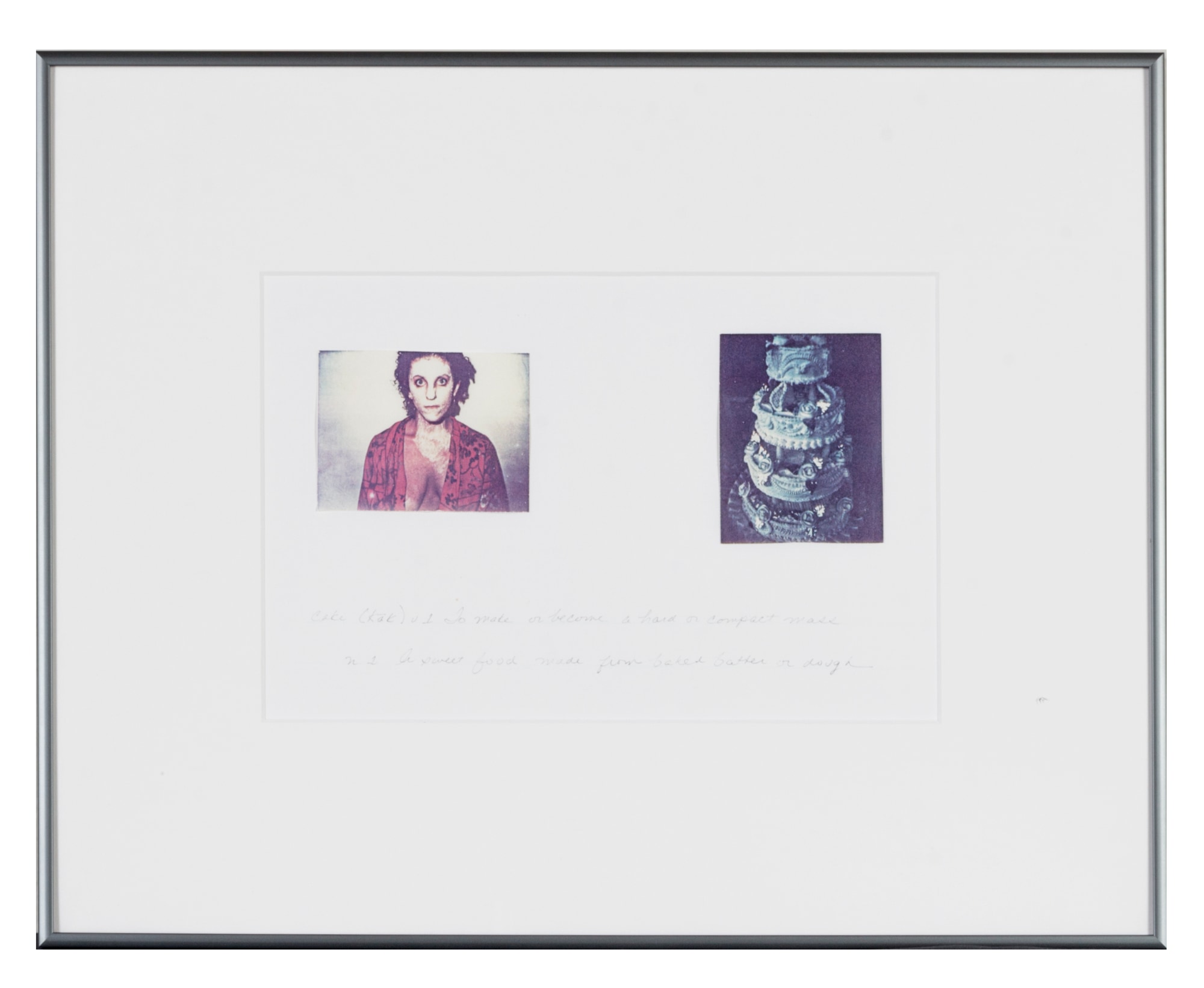 Two color Xerox images (approximately 3" x 4") are mounted next to each on a secondary support. The picture on the left is of a woman white ( cake icing?) covering her face, neck and chest. She is wearing an open robe. The image on the right is of an elaborately decorated, multitiered with a blue cast. Black printed text, underneath the photos is the following: "Cake (kãk) u1to make or become a hard or compact mess n 1 a sweet food made from baked batter or dough."