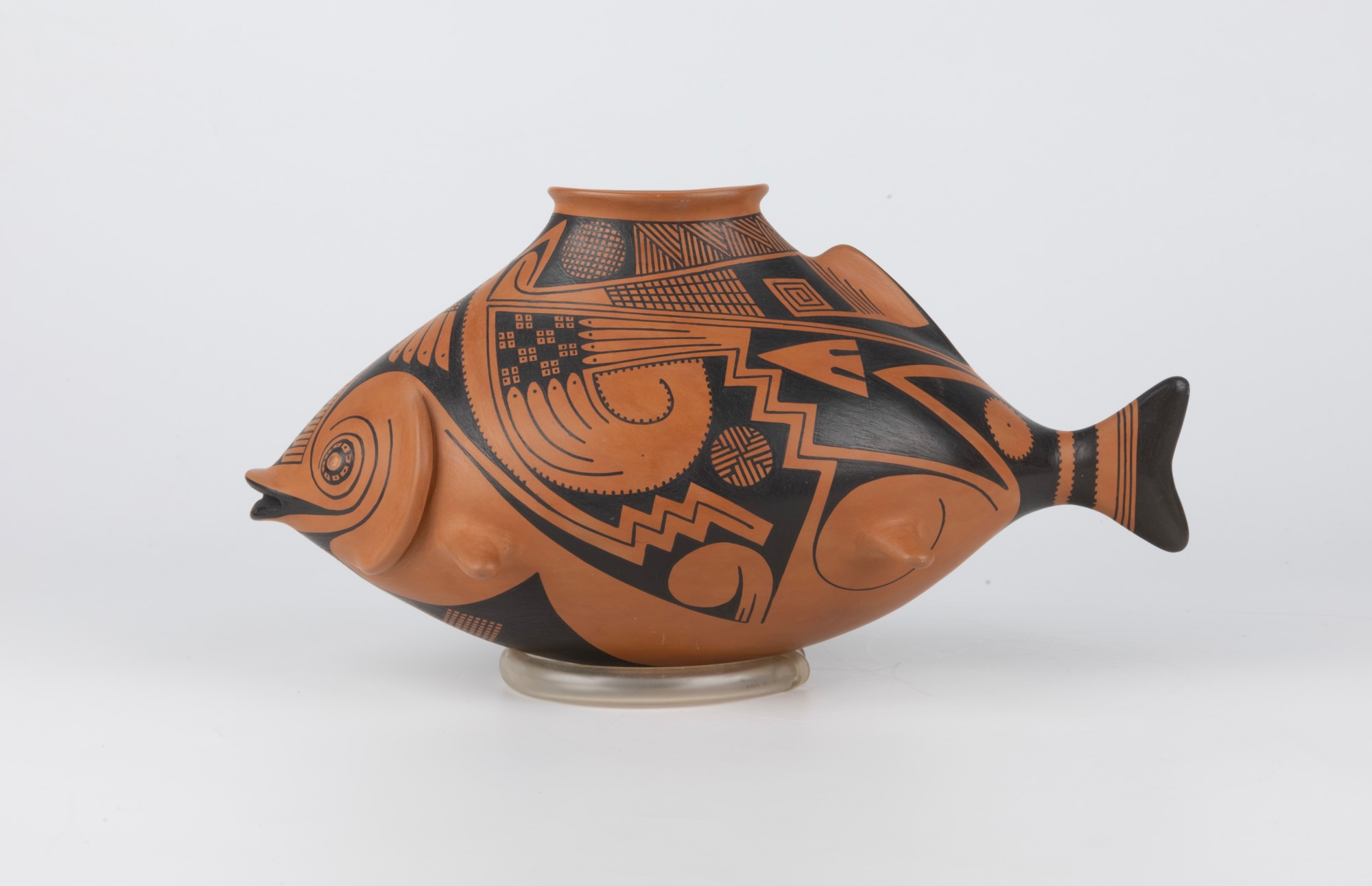 Medium sized fish-shaped pot. Terracotta colored with black geometric detailing.