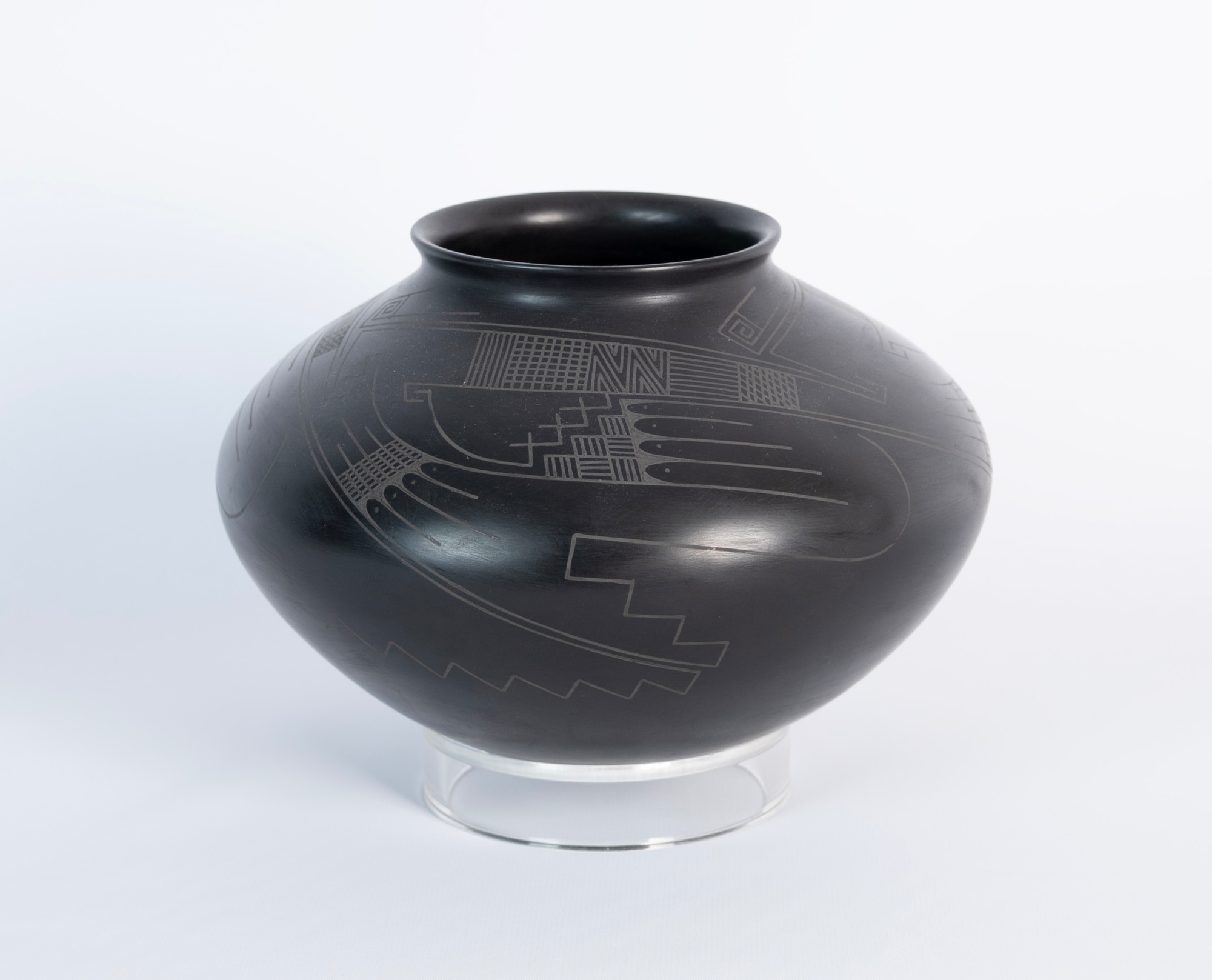 Medium oval shaped pot with flared rim. Opening of pot measures approximately 4 inches in diameter. Black with black geometric detailing.
