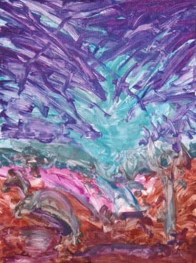Abstract. Top half purple with diagonal lines over laping blue. Bottom half are painterly brushstrokes of various purple tones and brown tones.