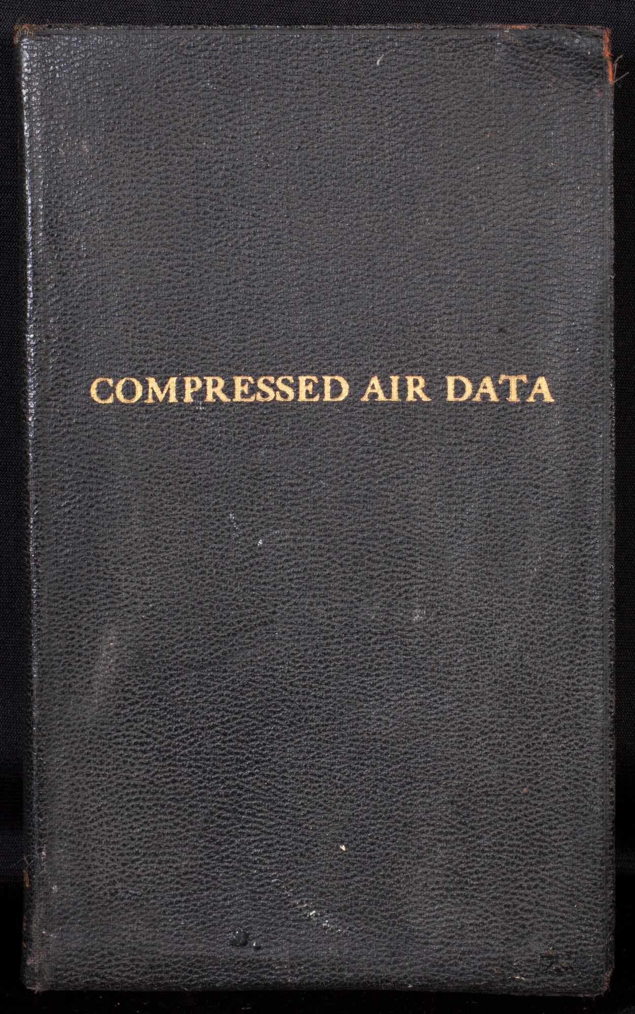 Soft cover book titled "Compression Air Data". The cover is black and the title on the cover. text on the spine and all edges of the text block are gold foiled. This is an object to be placed on shelf with others in this group.