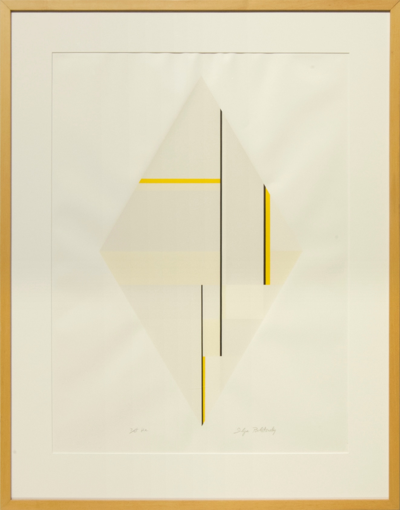 Geometric abstract composition of a white diamond with yellow, black and off-white lines and rectangles intersecting at various points within the diamond.