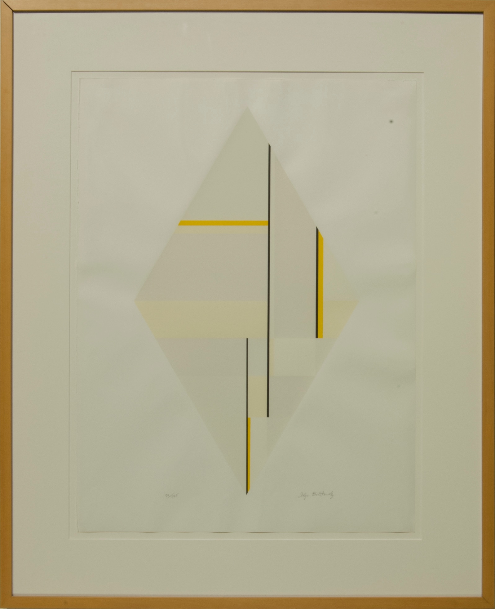 Geometric abstract composition of a white diamond with yellow, black and off-white lines and rectangles intersecting at various points within the diamond.