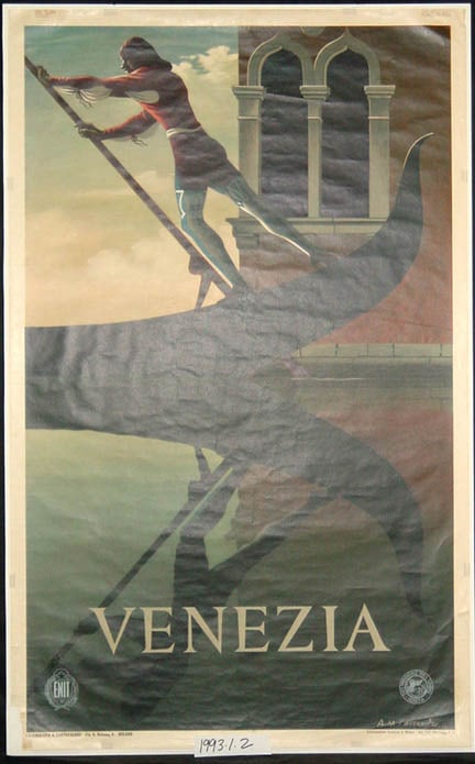 vintage travel poster of Venice with man in a gondola in a canal. "Venezia" is at the bottom of the poster.