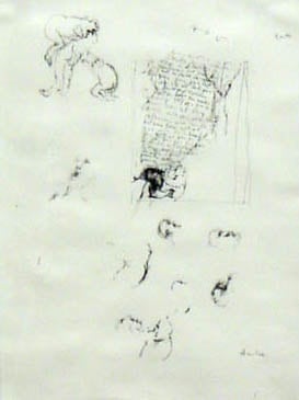 Sketch style etching of various figures and facial profiles. Top left corner has a sketch of 3 nude figures engaging each other physically. Center right is a narrative with a rectangular border. Piece is mounted to a mat board.