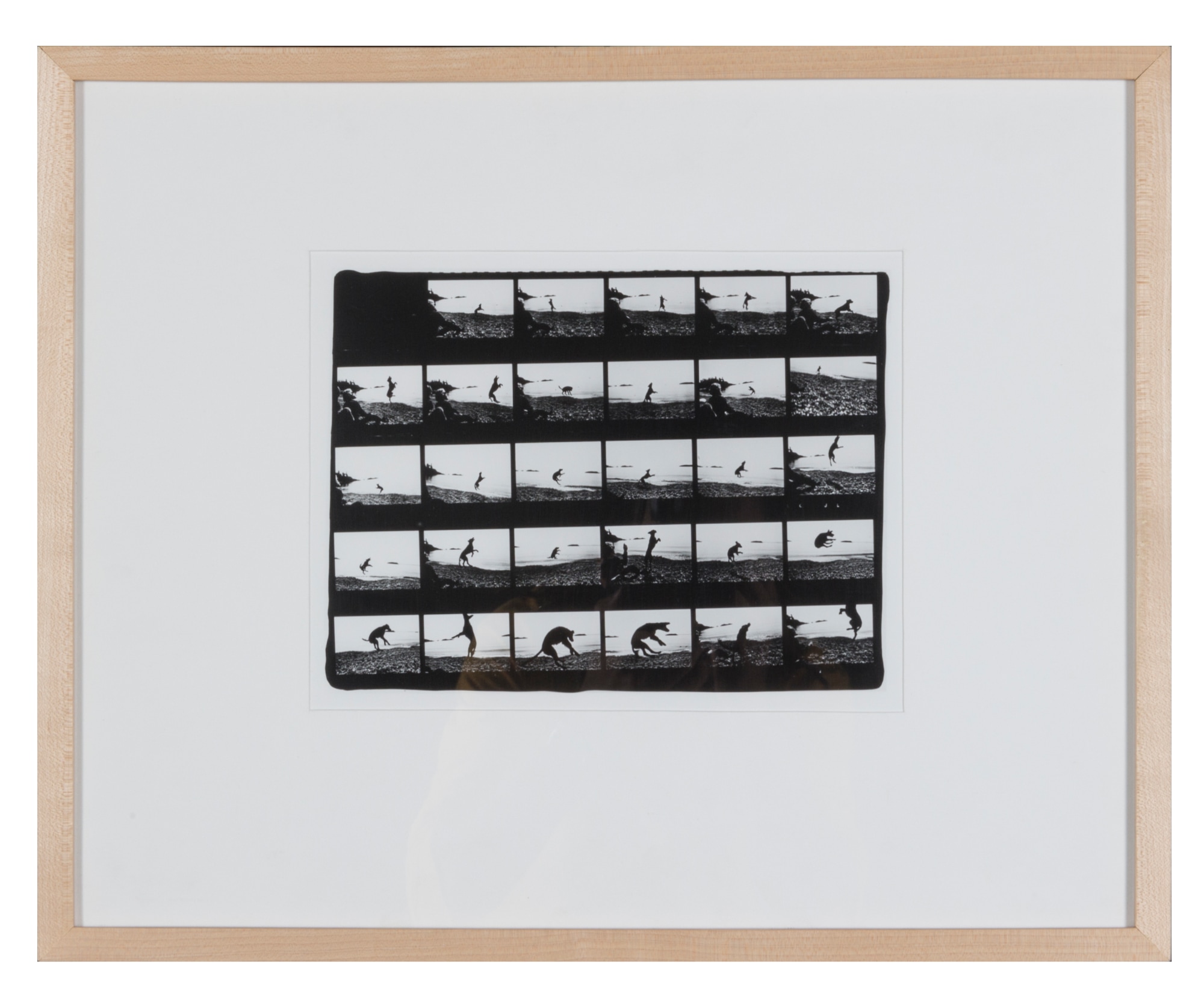 Black-and-white proof sheet that shows the progression of a dog playing catch on the beach.