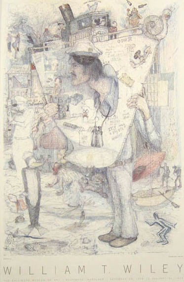 multicolor poster for William T. Wiley exhibition in Baltimore MOMA. Image: color pencil drawing of a sailor, his head through a cutout of a ship. He is surrounded by nautical imagery, light houses, penguin, fish, whales