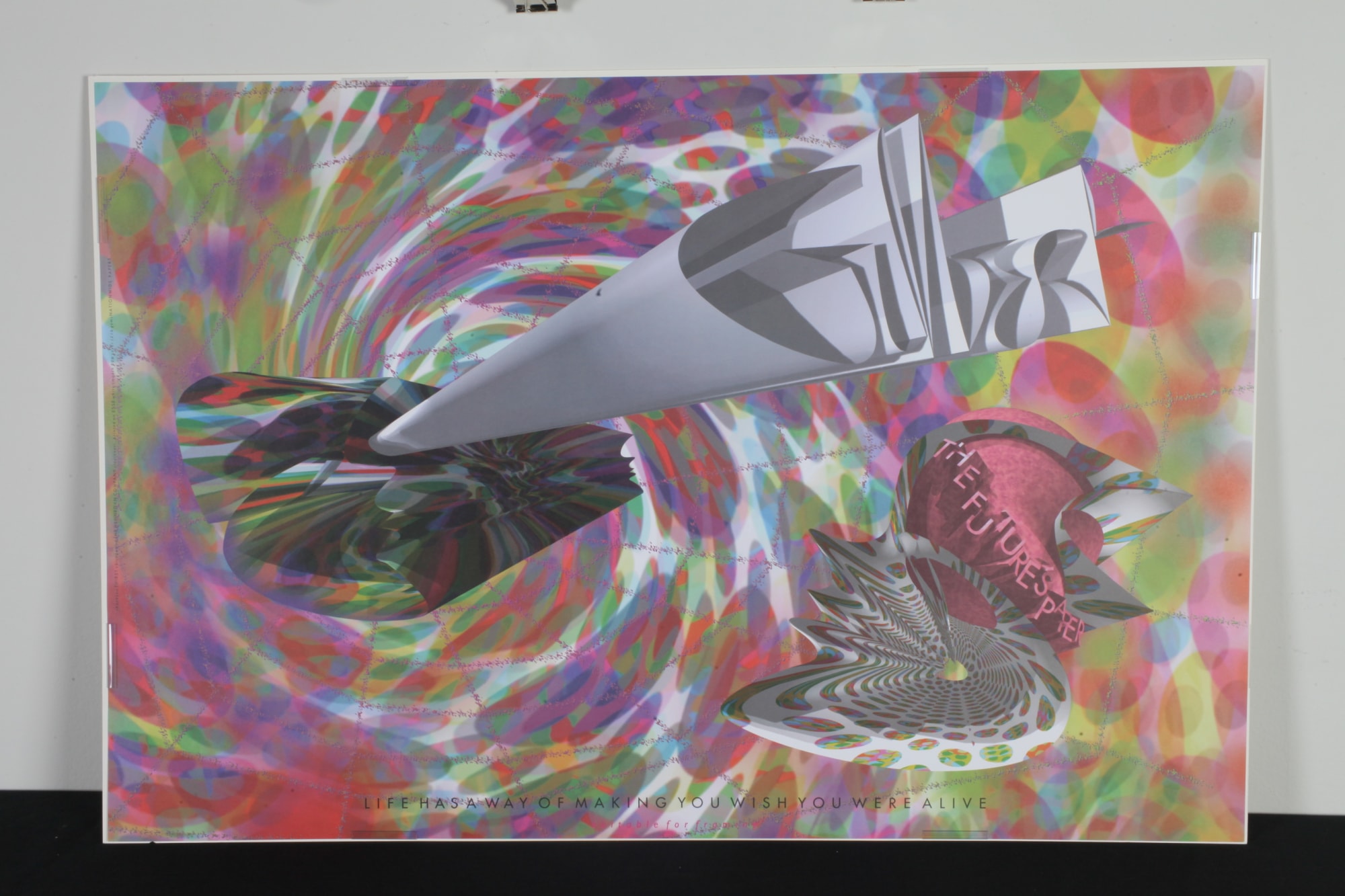 Abstract conglomerate of vibrant colors and organic graphic shape illegible gray texr projects 3-d from center. Round orb with " The Future's Paper" on it. Also the bottom of image there is black text that reads" Life has a way of making you wish you were alive" (uppercase). In magenta "suitable for framing" in lowercase. The dominating pattern is made from ellipses and and a spider web pattern. Text along the left edge that tells about the paper. "Thank you Thirst chicago and The Henegan Company cincinati".