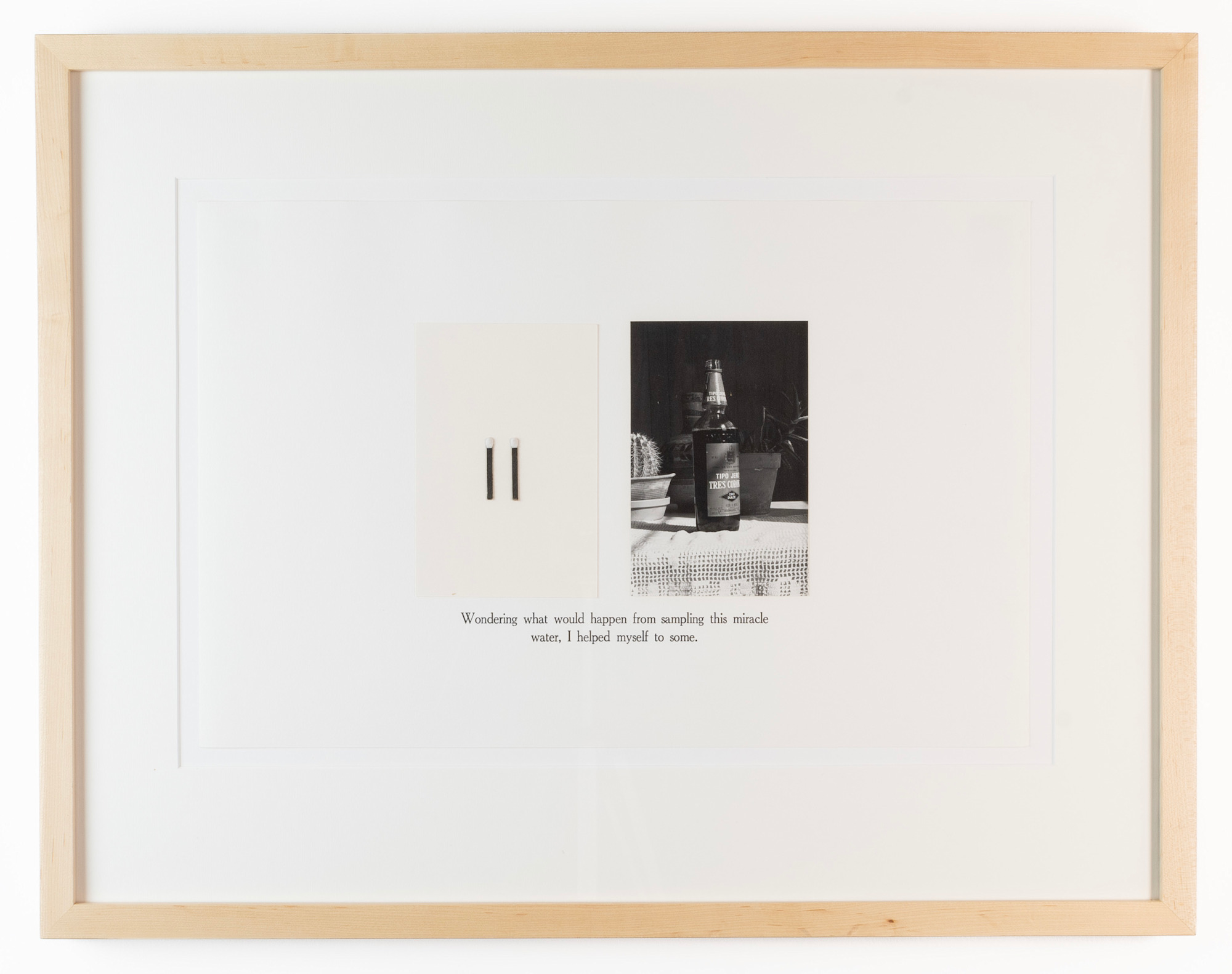 Two 6x4" pieces mounted side by side on a white piece of paper that is dry mounted to a board. The left piece is comprised of two white matches mounted on a piece of paper. The second piece is a black and white photograph of a beverage bottle on top of a table. Text printed below the two pieces reads, " Wondering what "