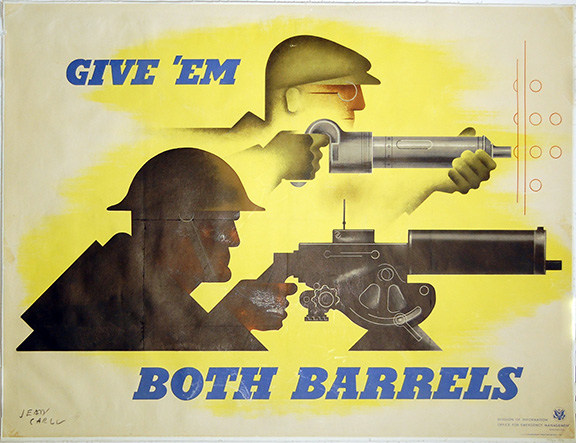 Image of an intent soldier firing a machine gun just in front of a rivet gunner in a similar stance. Their positions echo the message that both are dependent on the efforts of the other.