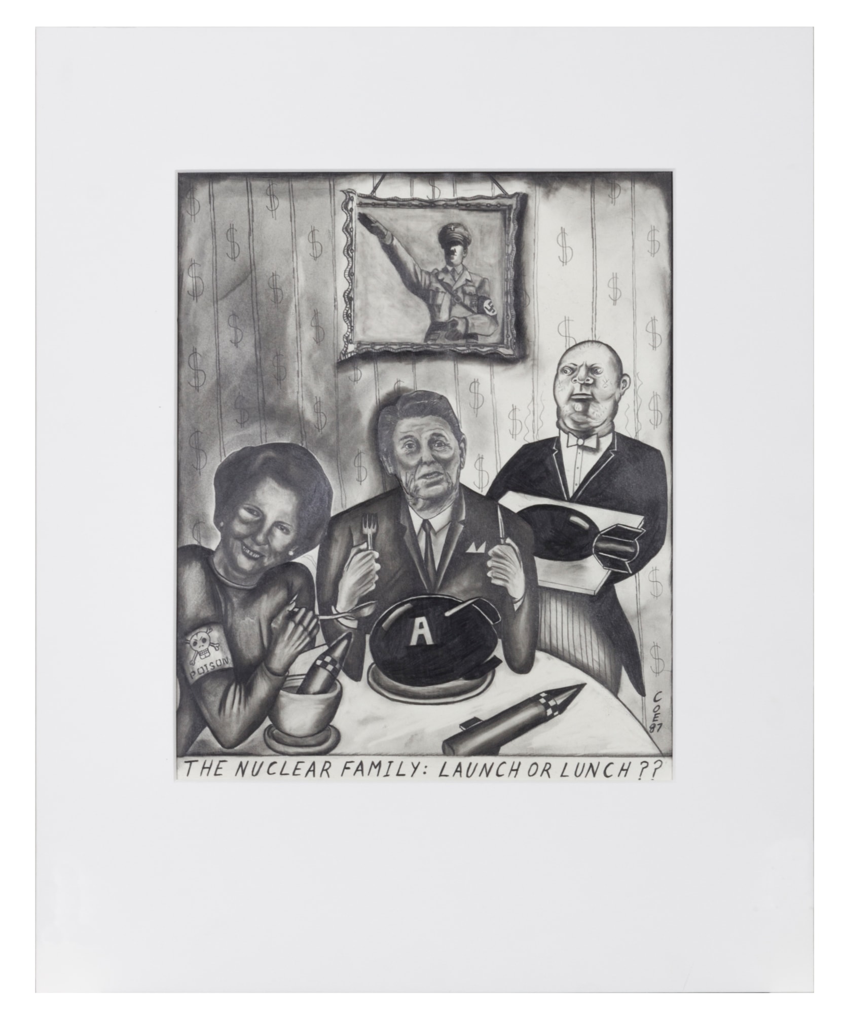 Drawing of Margaret Thatcher (LLC), Ronald Reagan (center) sitting at a table enjoying a lunch of nuclear missiles and a "A" bomb. Behind them is a butler serving another bomb. The walls are decorated with dollar sign wall paper and a hanging portrait of a saluting Adolph Hitler. Thatcher and Reagan's heads, along with most of the Hitler portrait are collaged drawings. Text at the bottom of the drawing reads, "The Nuclear Family: Launch or Lunch??"