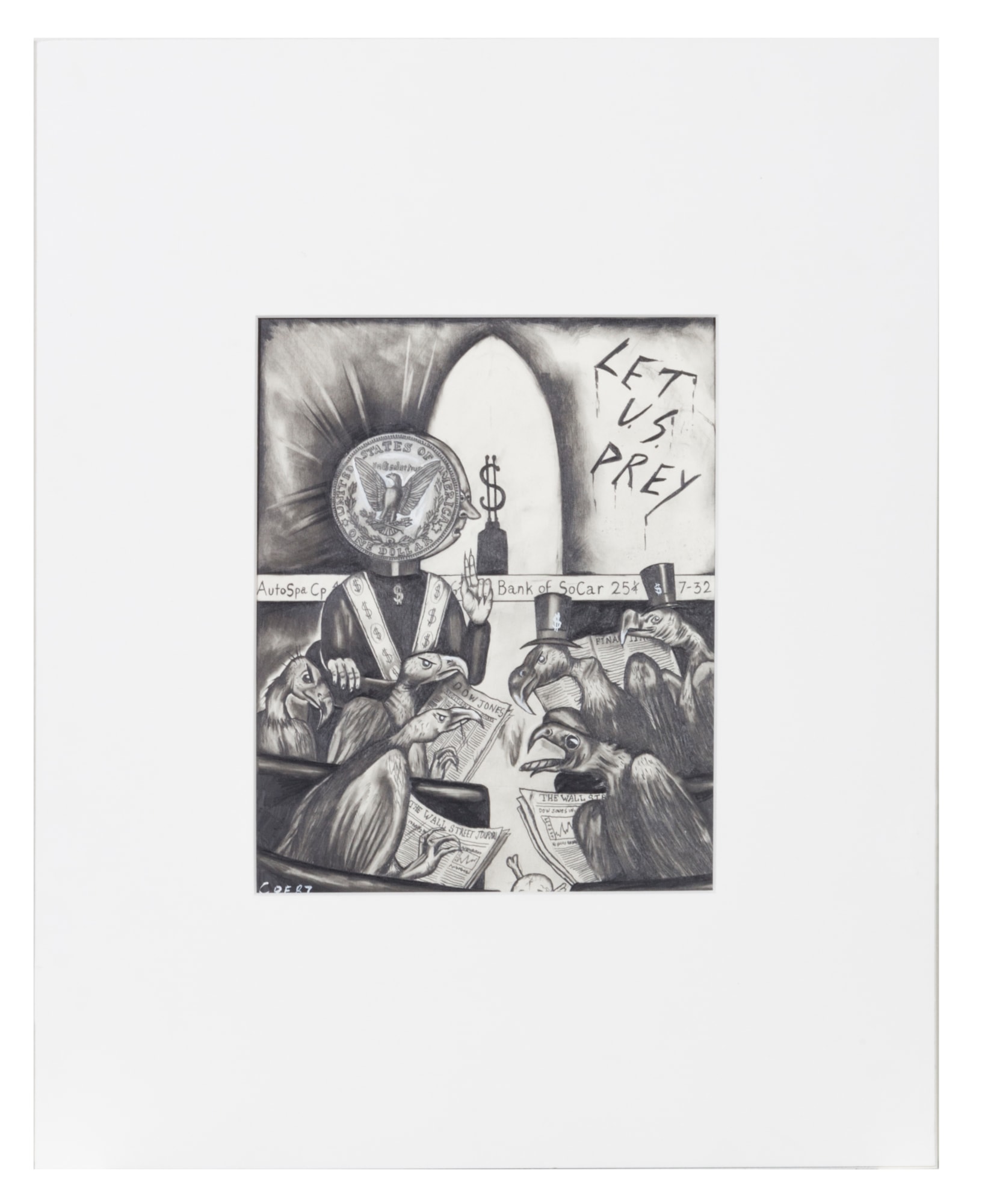 Black and white drawing of a committee ov vultures, some in top hats, others reading the finance section of the newspaper, arguing with each other. They are congregated in a church, and are being looked over by a priest like figure who has an U.S.A. quarter (tail side) for a head. The church is decorated with dollar/cifrao signs.