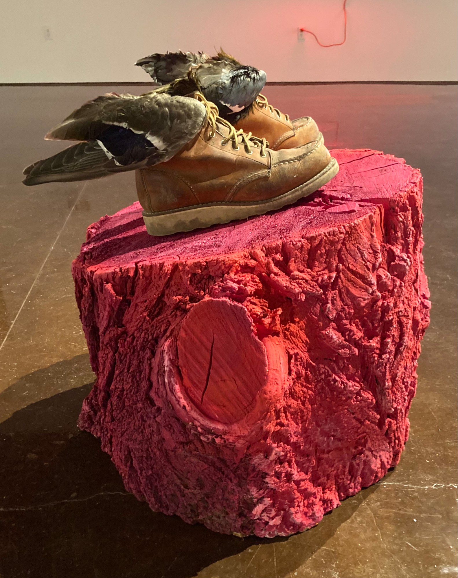 - Red Wing 6" Moc boots (the artist's work boots), mallard duck wings, teal winged duck wings, embroidery thread, and painted cottonwood stump