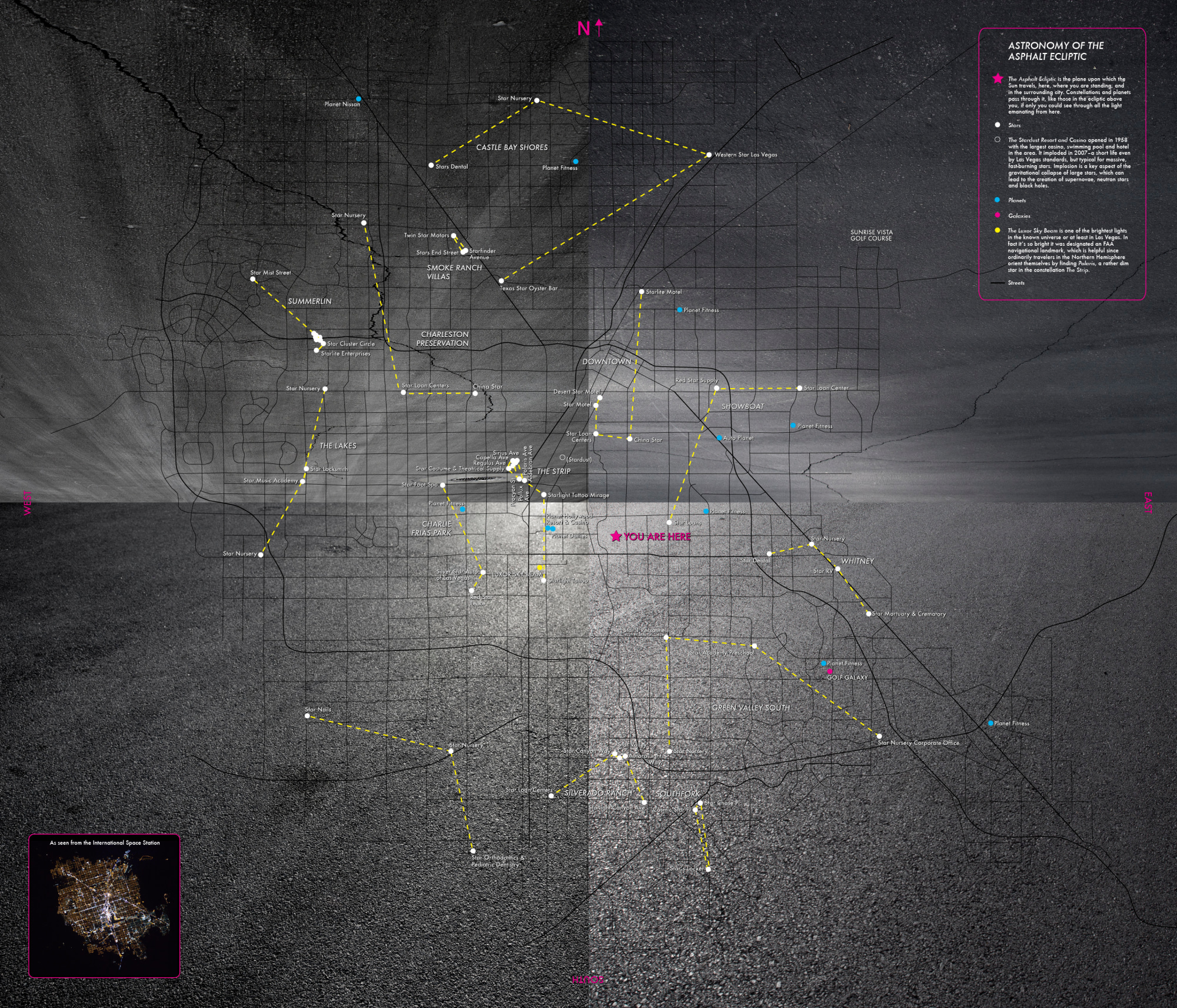 Using the word “star” as a pivot, Katarina Jerinic brings two types of maps into an unfamiliar correspondence—maps that make sense of the urban landmarks we pass every day, and the constellation maps we use to create patterns among the remote phenomena we will never visit. The original version of the Asphalt Ecliptic was a series of five temporary signs installed outside the Barrick in the Donald H. Baepler Xeric Garden. Visitors walked from sign to sign, finding new constellations as they moved. After that project ended, Jerinic combined the signs into a single map, making a new artwork that could be framed, stored, and shown in perpetuity. (DKS)