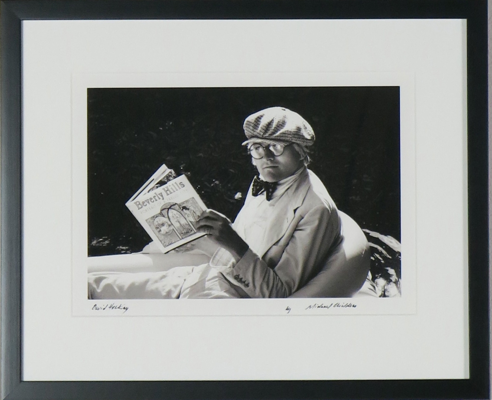 A black and white photograph of a man lounging in a raft with an open book titled “Beverly Hills” in bold text. He wears a checkered cap, round glasses, a dark bow tie, and light suit and turns his head to look at the camera with a relaxed expression.