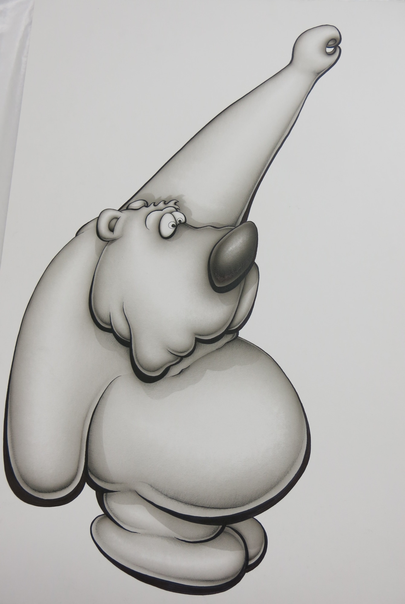 A grayscale illustration of a fat cartoon bear with crossed eyes and a large dark nose. The bear has its left arm extended upwards with the fingers curled as if it is gripping something, but no object is visible. It has a large rounded stomach and two oval shaped feet. The figure is light gray outlined in black (written by Andrea Noonoo).