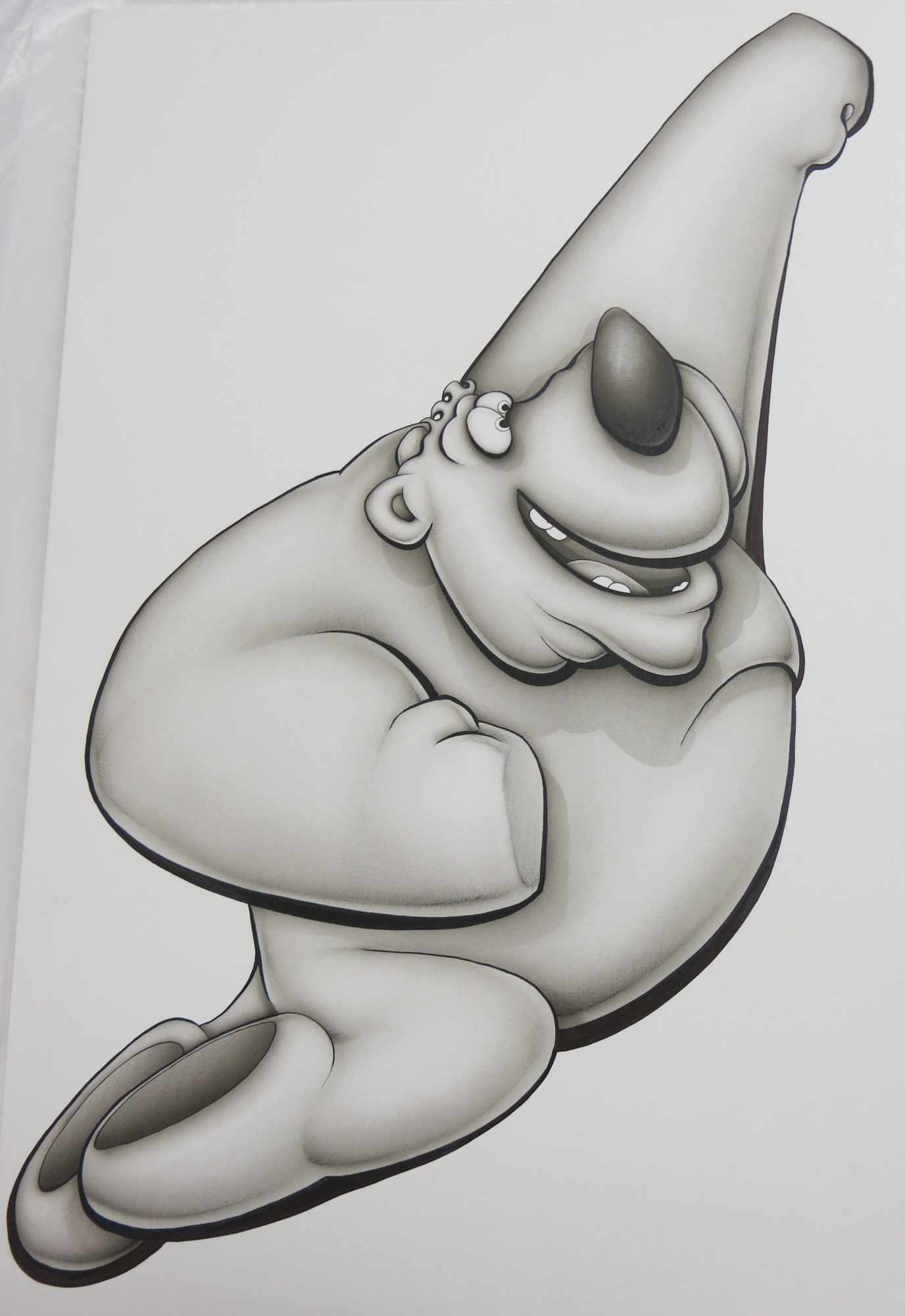 A grayscale illustration of a cartoon bear with crossed eyes, a wide smile, and a large dark nose. The bear strikes a superhero pose by expanding its chest, thrusting one fist skywards, and drawing the other fist back vigorously. One knee is pulled forward while the other leg is extended tautly behind it, a juxtaposition that suggests muscular effort. Its body is light gray with a dark black outline (written by Andrea Noonoo).