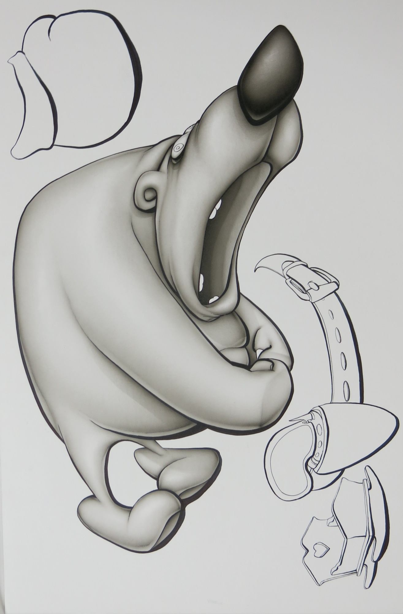 A grayscale illustration of a fat cartoon bear with a large nose. The bear is posed in exaggerated distress. Its mouth and eyes are stretched open, its back is hunched so that its shoulders wrinkle forward against the back of its head, its legs are twisted so that its toes pivot inwards, and its arms are extended around its protruding stomach with the paws bunched like fists. To the lower right of the bear there is a line drawing of a small cradle with a heart on the headboard below a cartoony handgun in a holster attached to a belt. To the upper left there is a line drawing of an object that may be a boxing glove clenched like a fist (written by Andrea Noonoo).