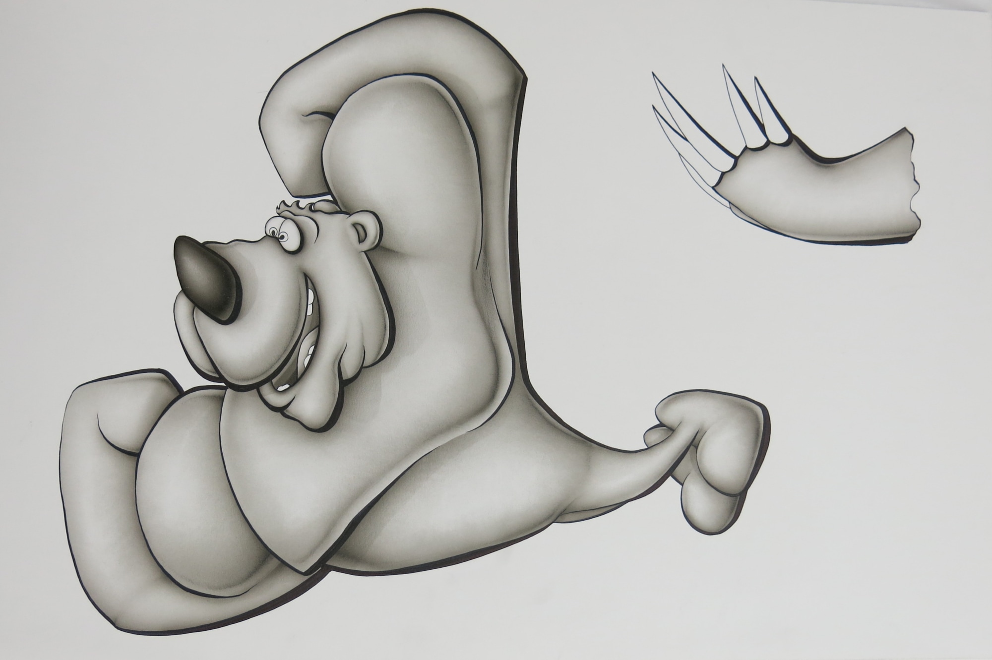 A grayscale illustration of a cartoon bear with crossed eyes, a wide, open-mouthed smile, and a large dark nose. The bear is posing like a bodybuilder with its arms curled upwards to make its biceps bulge. Its chest and shoulders are broad. Somehow it is holding this pose sideways, as if the unseen surface it is standing on runs vertically across the image instead of horizontally. A disembodied cartoon bear arm is positioned in the upper right of the image. It extends a set of long, sharp claws in the bear’s direction. The figure is light gray and outlined with a dark black line (written by Andrea Noonoo).