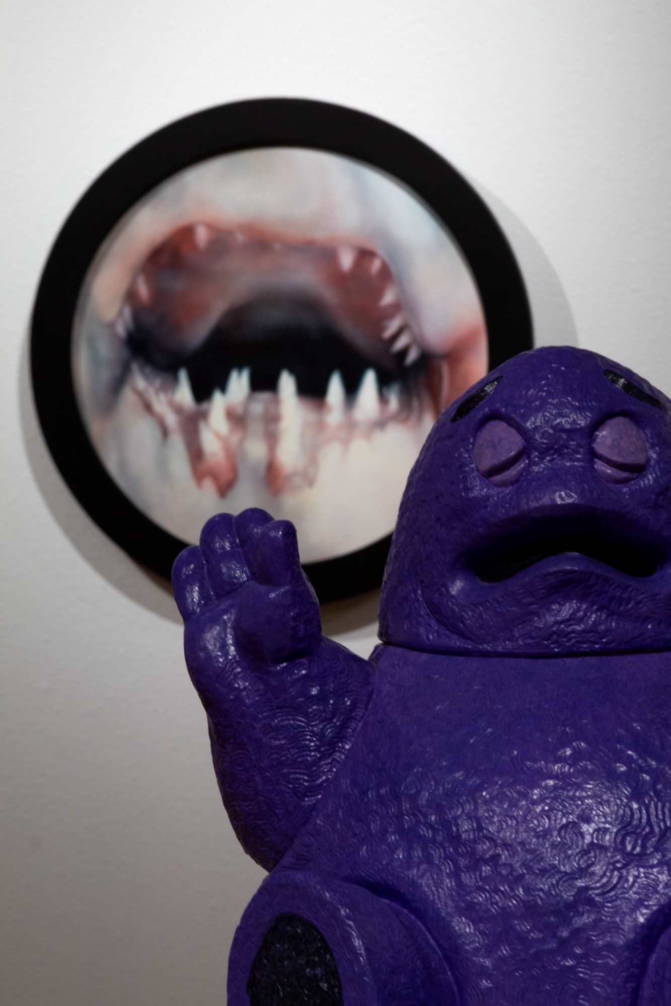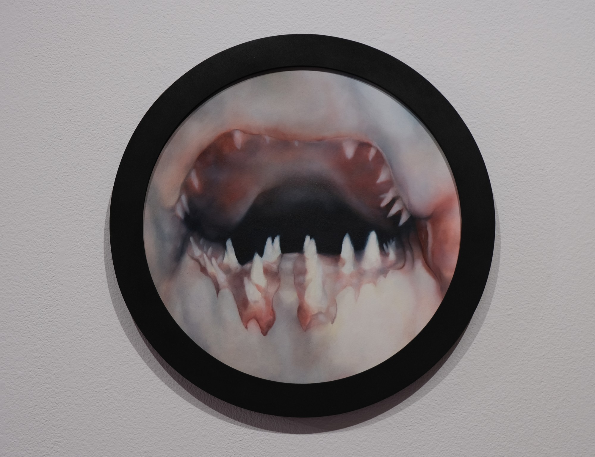 Item description: A framed, circular painting of a shark’s mouth with numerous sharp teeth at the top and bottom of the open jaws.