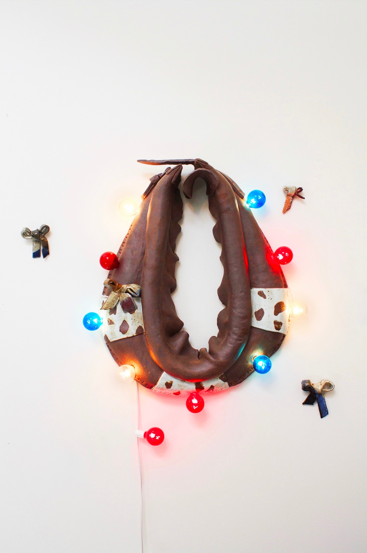 Item description: A hanging brown horse collar made of stoneware. Broad streaks of speckled white glaze, with patches of unglazed brown peaking through, go off the collar's right, left and center. Lit lightbulbs in a sequence of blue, red and white run along the edge of the collar. A string of the same light bulbs fall from behind its bottom right, tangling on the floor. Surrounding the collar, zigzagging down from right to left, are three shiny unevenly-"tied" ceramic bows varying between brown, green, white and blue.