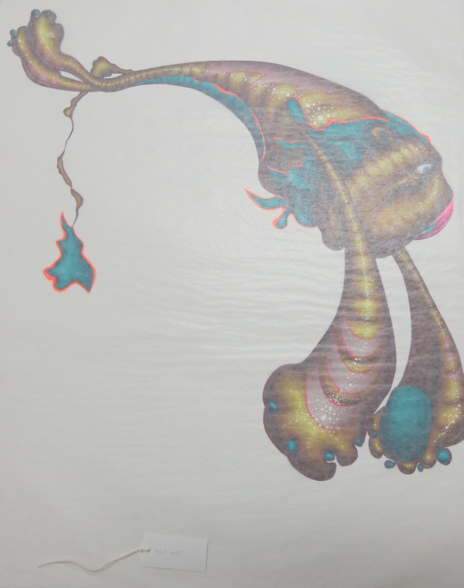 An illustration of a cartoonish animal that combines the attributes of a lion and a tiger. The animal is leaping towards the right side of the image with its enormous forepaws thrust downwards. Its tail trails between its diminutive hind legs. The animal is striped brown and gold with pink markings, a bright pink nose, blue eyes, and a turquoise mane and claws. The entire image is covered with a translucent, reflective sheet (written by Andrea Noonoo).