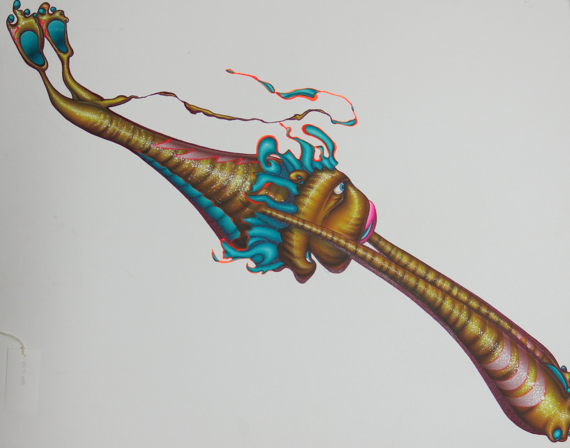 An illustration of a cartoonish animal that combines the attributes of a lion and a tiger. The animal is leaping diagonally across the image with its small hind legs tilting upwards into the top left corner and its forepaws arcing forcefully down into the bottom right. Its tail flies forward as its mane flies back. The animal is striped brown, gold, and pink, with a bright pink nose, blue eyes, and a turquoise mane and claws (written by Andrea Noonoo).