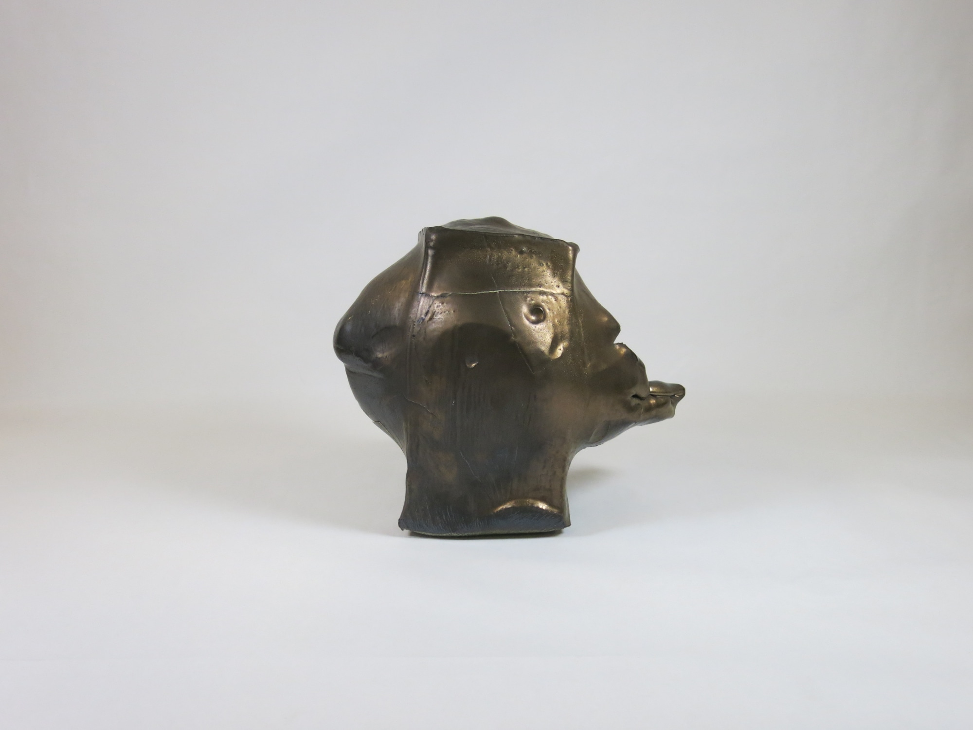 A pair of abstract sculptural forms. The base of each form is roughly square, but above the base they erupt outwards into a variety of swellings and protrusions as if they have been subjected to explosive pressure from within. The object on the right is black; the one on the left is black with touches of gold where it catches the light.